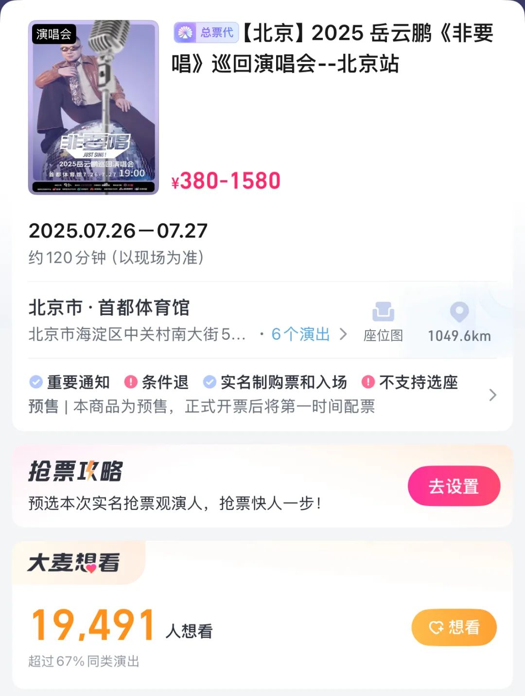 6月12日上午10点18分,岳云鹏“非要唱”北京演唱会优先购正式开票,售价到380元到1580元之间,分6个档位,有2万多人标注了想看,大麦显示初始开售时7月26日全场可售门票总张数为4200张。