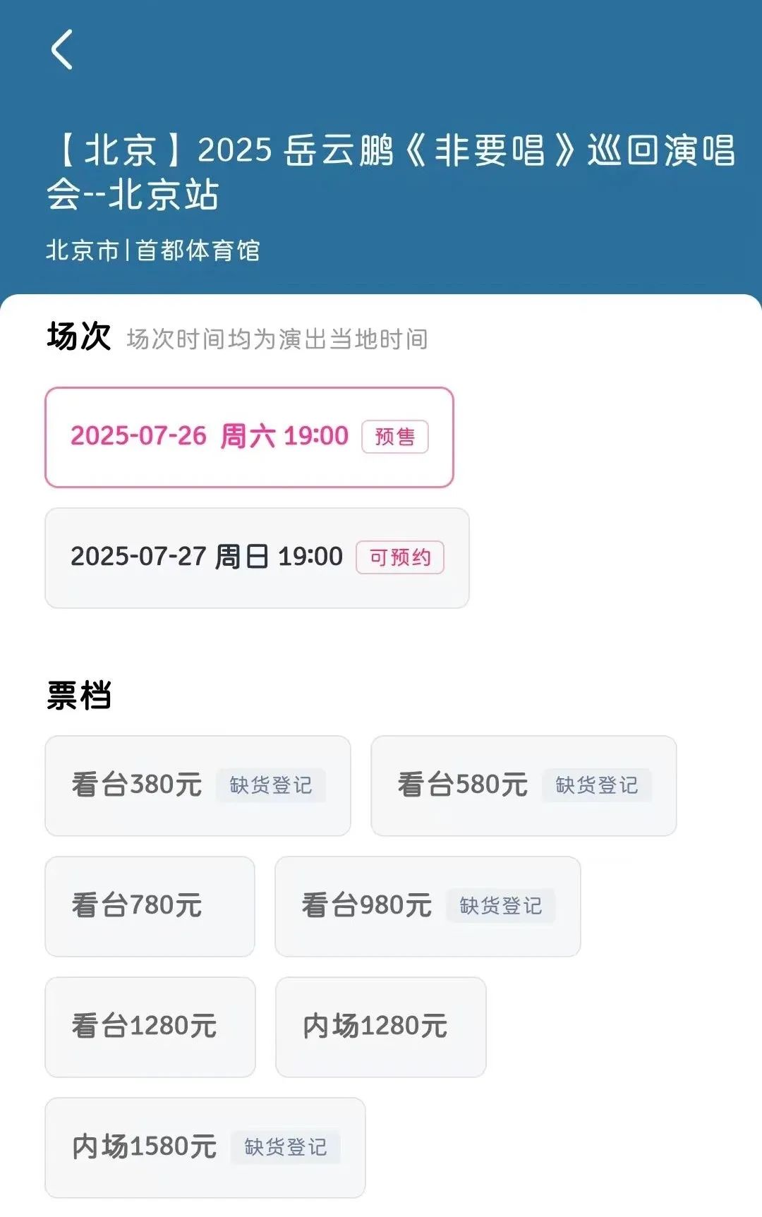 到10点19分,该场演唱会看台380元、580元、980元档位售罄,内场1580元档位售罄。