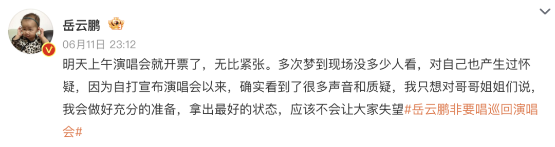 11日晚,岳云鹏发文回应质疑:“明天上午演唱会就开票了,无比紧张。多次梦到现场没多少人看,对自己也产生过怀疑,因为自打宣布演唱会以来,确实看到了很多声音和质疑,我只想对哥哥姐姐们说,我会做好充分的准备,拿出最好的状态,应该不会让大家失望。”